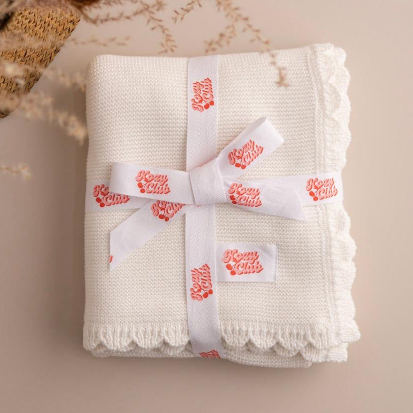 Our Heirloom Scalloped Knit Blanket is a timeless keepsake designed with delicate scalloped edge detailing—perfectly paired with our rompers and made to be treasured.
