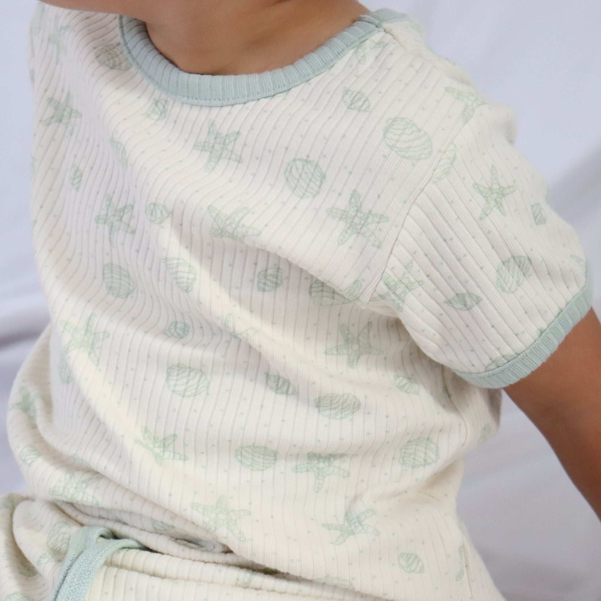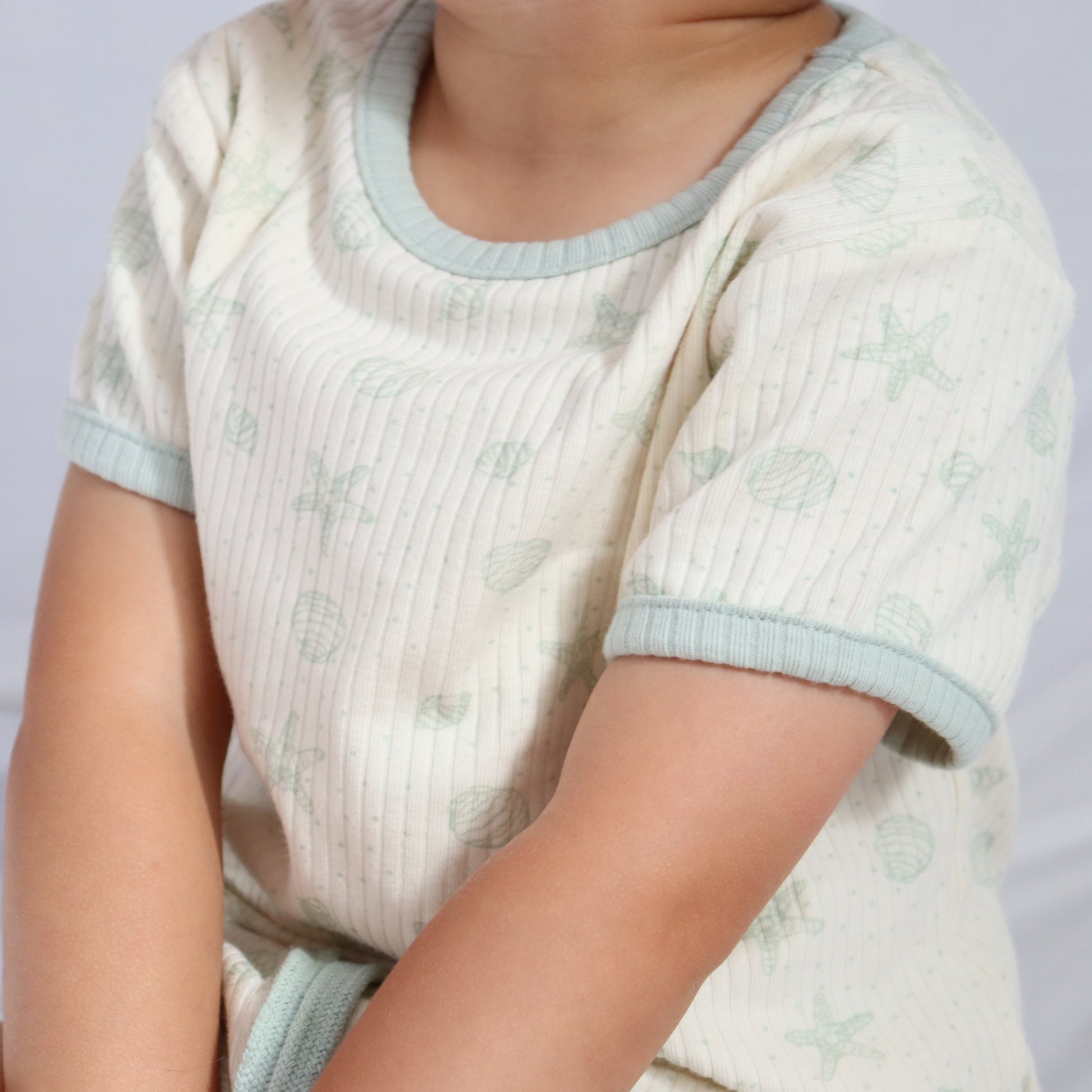 The Seaside Sage Set features a serene sage shell print on a creamy base — a perfect blend of calm tones and playful spirit. Made from our signature ribbed cotton-spandex fabric, it’s light, breathable, and made to move with every little adventure.