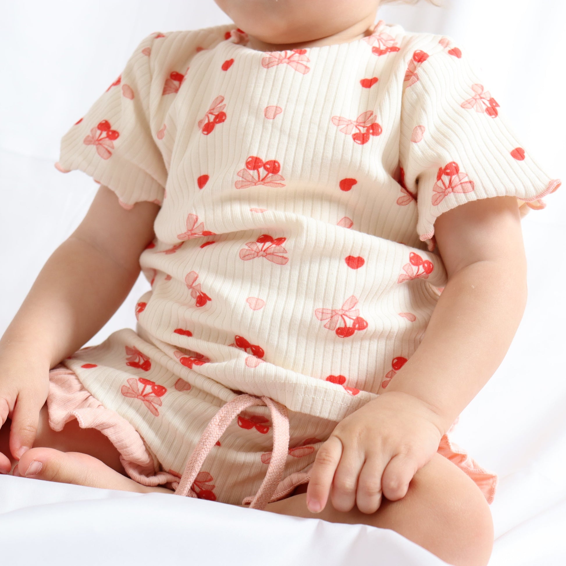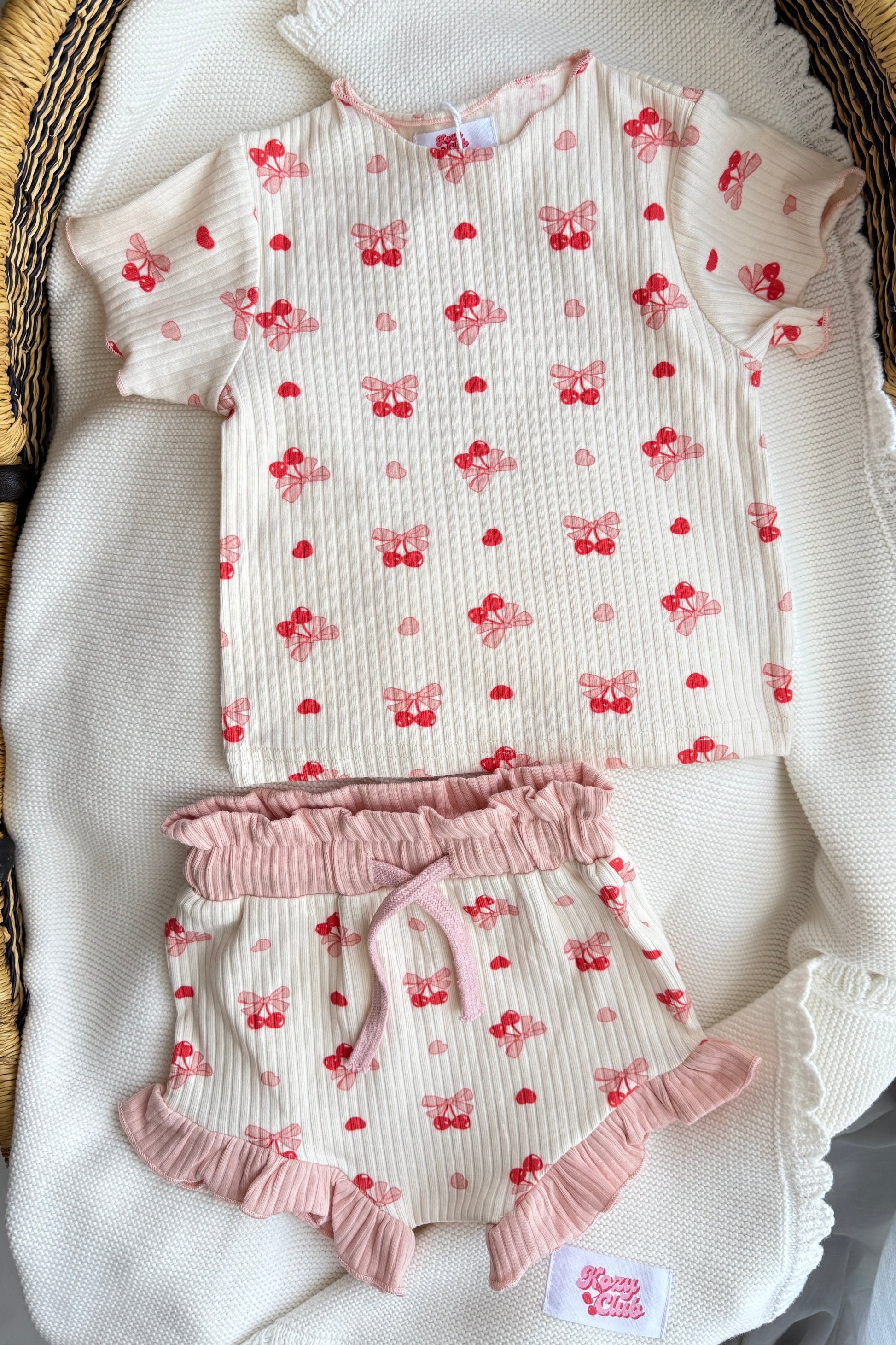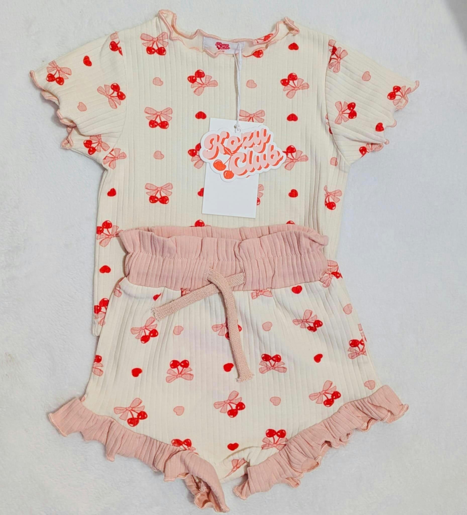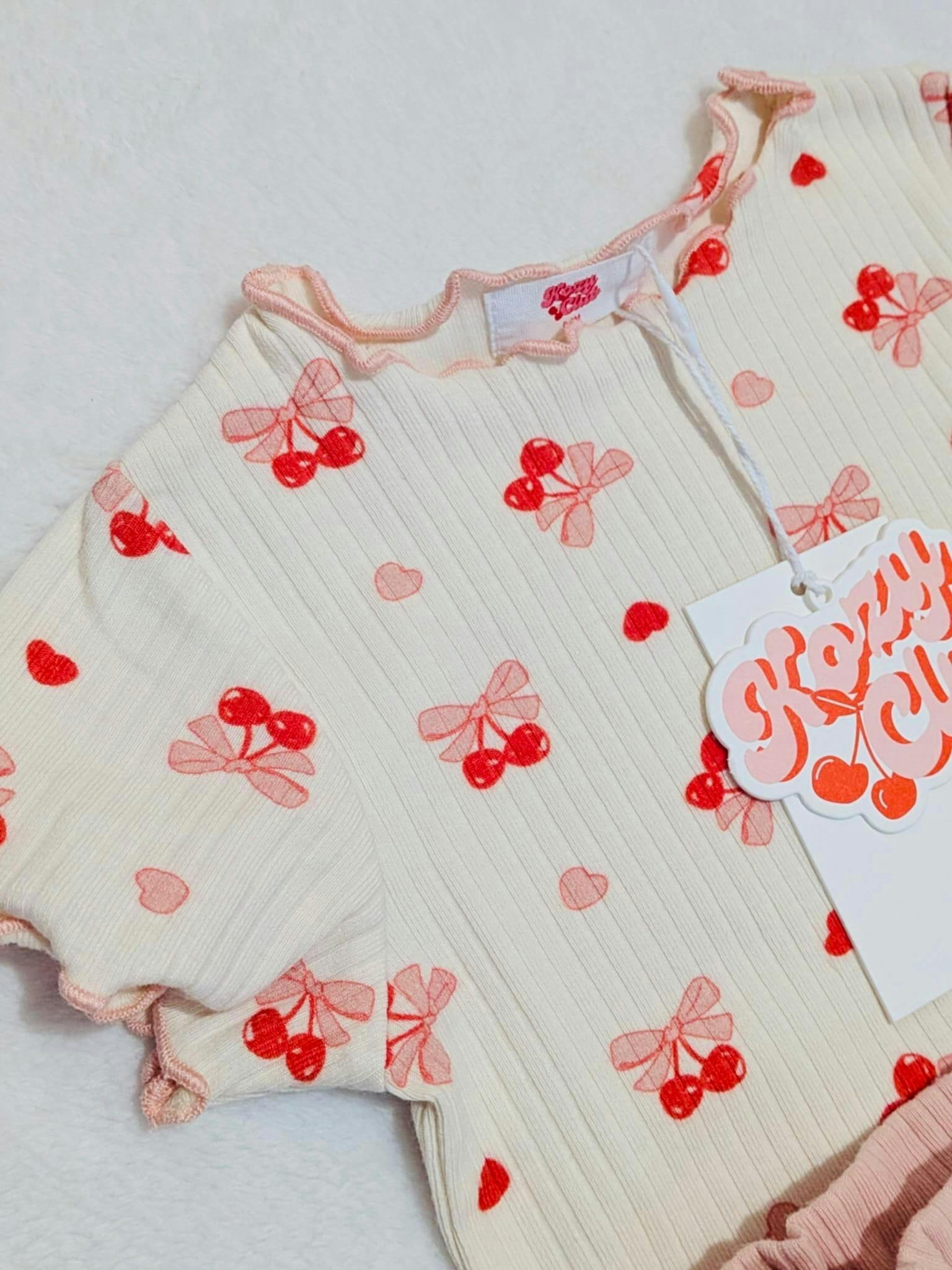 Designed with versatility in mind, each piece can be effortlessly mixed and matched with our Blush Cream Summer Set — pair the cherry top with blush shorts or the blush top with cherry bottoms for even more adorable summer looks.