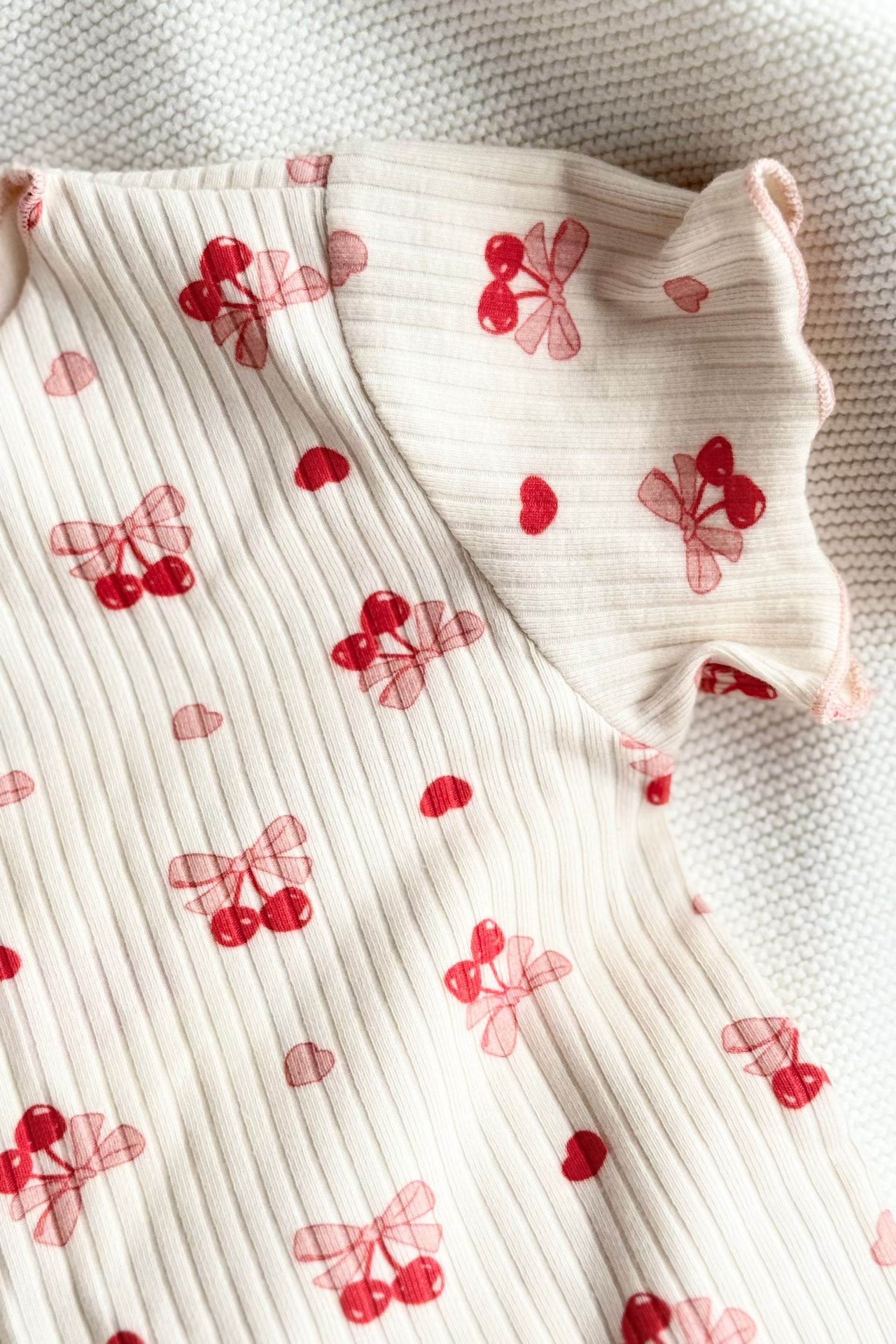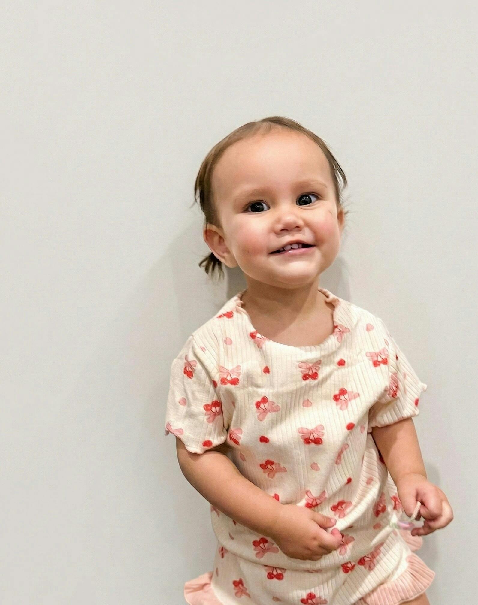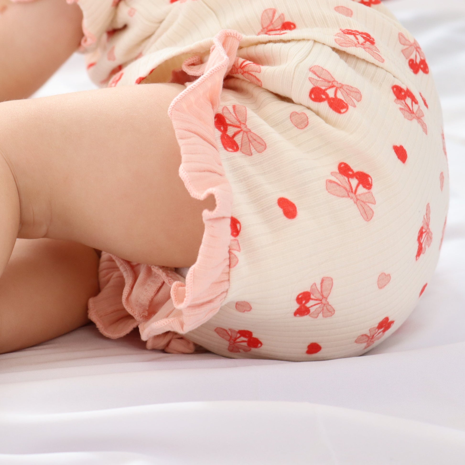 I am obsessed with this outfit! The fabric is soft, lightweight, and super breathable — perfect for our hot Aussie days. The ribbed texture feels really comfy on bub’s skin, and the flutter sleeves and cute little bow + cherry print are even sweeter in person.