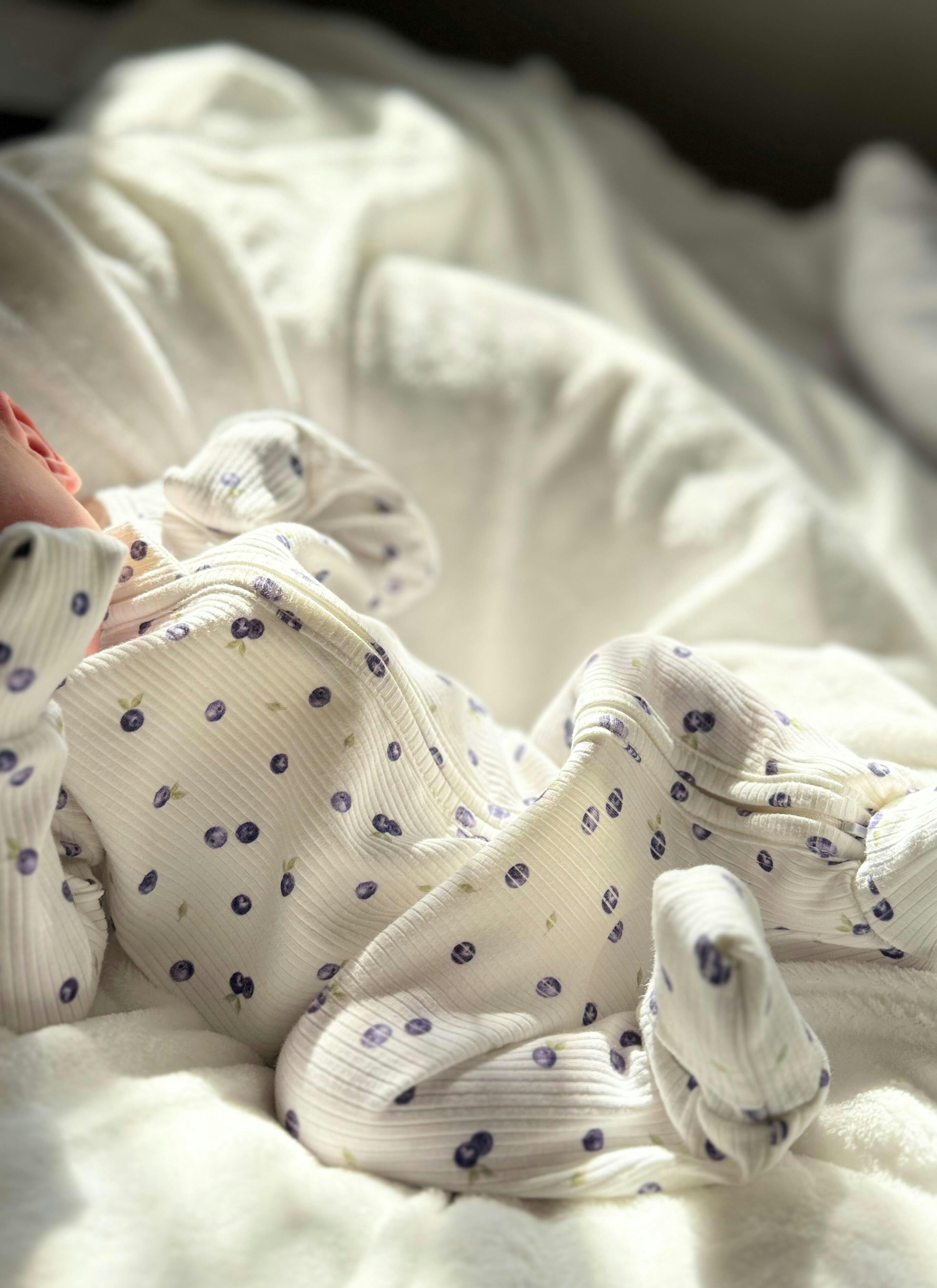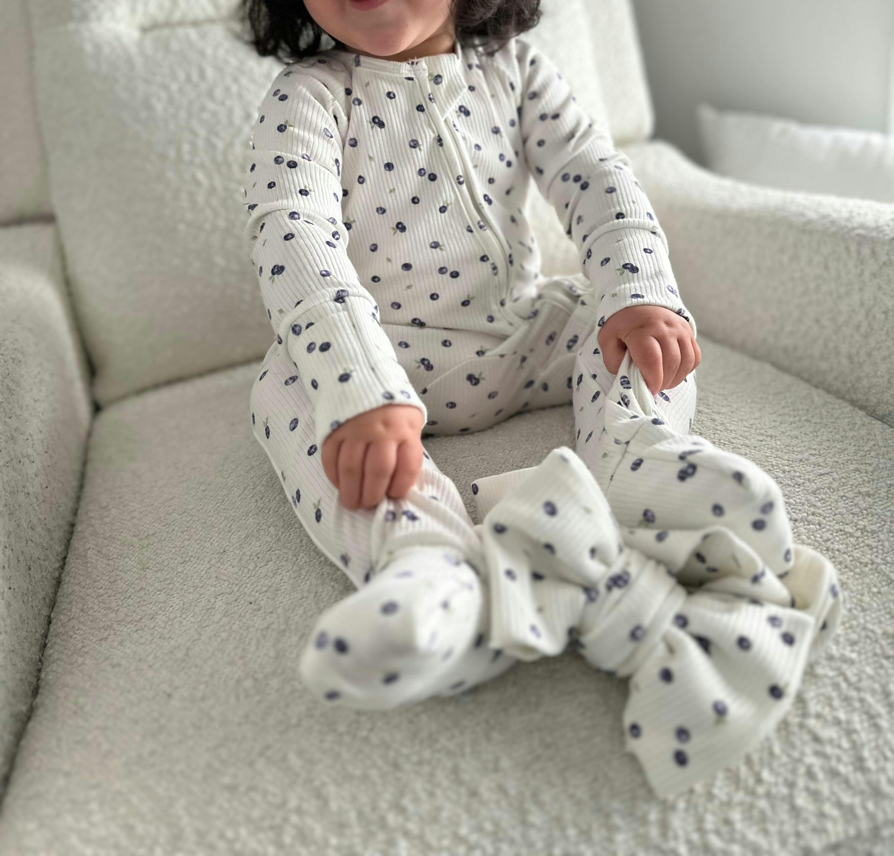 One of my first purchases from Kozy Club was the sweet blueberries romper and I fell in love with it! The feet and mittens are the perfect size to keep hands and feet covered! The print is so soft sweet, it’s one of my personal favourites, and the material is so soft and stretchy